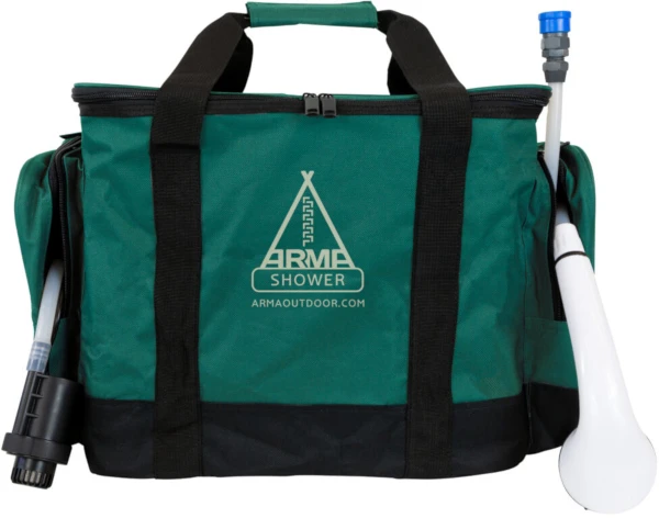 De ArmA Outdoor Shower is een draagbare douche, speciaal voor de luxe visser of kampeerder. Deze douche verwarmt water tot maximaal 55ËšC en kan gebruikt worden door middel van een kraan of douchekop. Verder is de douche gemakkelijk te vervoeren door zijn lage gewicht (6kg) en stevige draagtas. De ArmA Outdoor Shower kan gebruikt worden in combinatie met een standaard butaan- of propaanfles en vereist 12 volt voor de ontsteking.