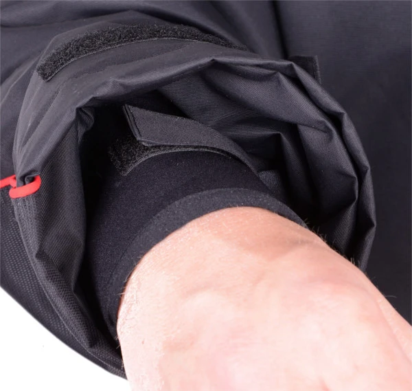 Het pak bestaat uit een water en winddichte jas, een uitneembare ultralichte jas en een water en winddichte bib broek met verstelbare bretellen.