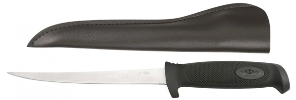 Dit Mikado Fillet Knife is gemaakt van het beste Japanse AUS8-staal, dat speciaal voor messen is ontwikkeld. Het mes is ongelooflijk licht, met een zorgvuldig vervaardigd flexibel lemmet en past zich perfect aan de rug van de vis aan zodat dat het vlees direct van het bot wordt gesneden. Het met rubber beklede ergonomische handvat biedt veel grip. Het mes wordt geleverd met een stevige en veilige houder.