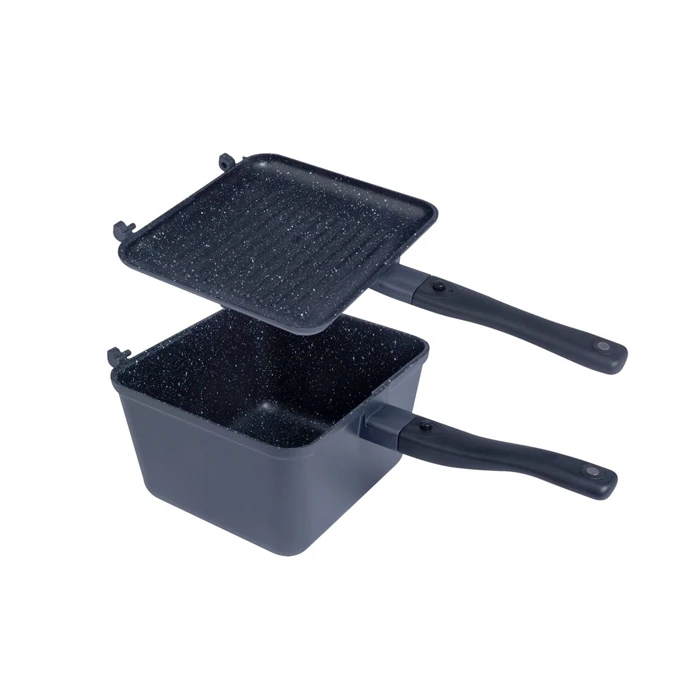 Deze RidgeMonkey Connect Deep Pan & Griddle is voorzien van een graniet style coating met verbeterde antiaanbak eigenschappen waardoor deze sterker en duurzamer is. De pan heeft afneembare cool-touch handgrepen en een afneembaar scharniersysteem dat één pan in twee verandert – een diepe pan en een aparte grillpan. De grillpan fungeert als deksel op de diepere pan en kan worden losgemaakt om een aparte pan te worden, zodat je twee hoeveelheden voedsel tegelijk kunt bereiden. De grillpan is ook uitwisselbaar met de RidgeMonkey Connect Sandwich Toaster Granite Edition.