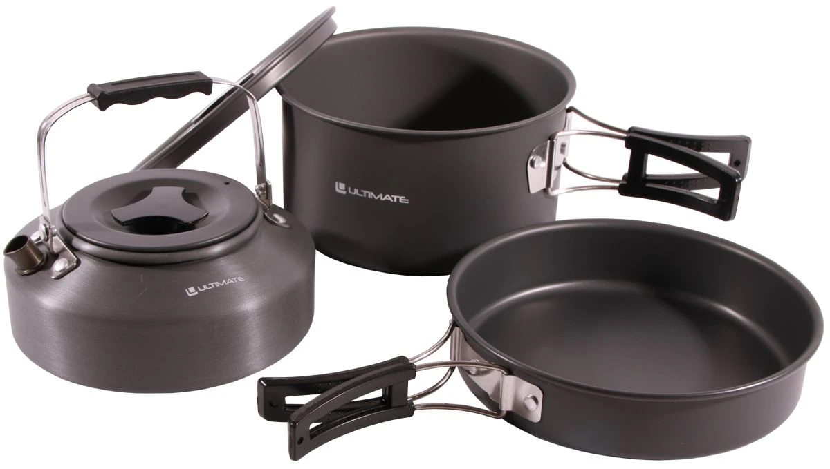 Met deze compacte Cooking Set van Ultimate kun je een eenvoudige maaltijd bereiden en verse koffie zetten aan de waterkant. De deal bestaat uit een waterketel, een koekenpan en een kookpan met inklapbare handgrepen, die precies in elkaar passen zodat het geheel super compact blijft. De pannen zijn gemaakt van geadoniseerd aluminium en voorzien van bakeliet handgrepen die ervoor zorgen dat je je vingers niet brandt. De set is geschikt voor 2-3 personen en wordt geleverd in een handige mesh draagtas. Onmisbaar bij iedere lange of meerdaagse vissessie!