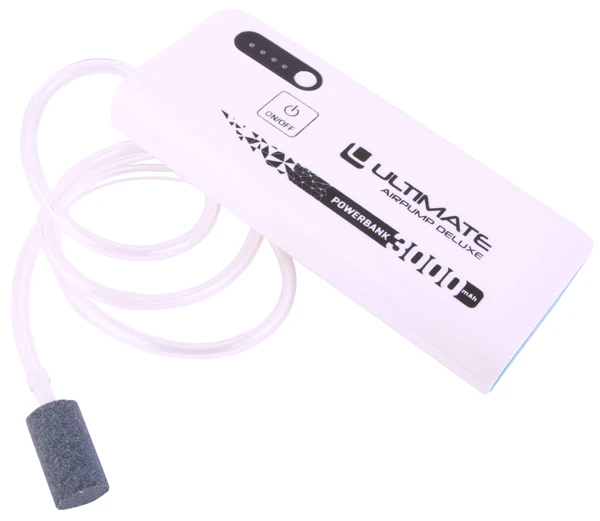 De Ultimate Power Bank Air Pump is een handige zuurstofpomp die voorzien is van een oplaadbare batterij die je ook als Powerbank kunt gebruiken om je smartphone op te laden. Verder is de pomp voorzien van een indicator light waar je mee kunt zien hoe vol de batterij is en een handig LED lampje. De pomp wordt compleet geleverd met een mini-USB kabel om deze op te laden. Ideaal bij het transport van aasvis!